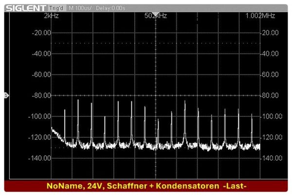 Diskussion: Auch hier ein klar definiertes Spektrum, ähnlich dem Meanwell. Die Amplitude ist etwas kleiner, weiterhin ist erkennbar, dass die Schaltfrequenz dieses Exemplars etwas höher ist.