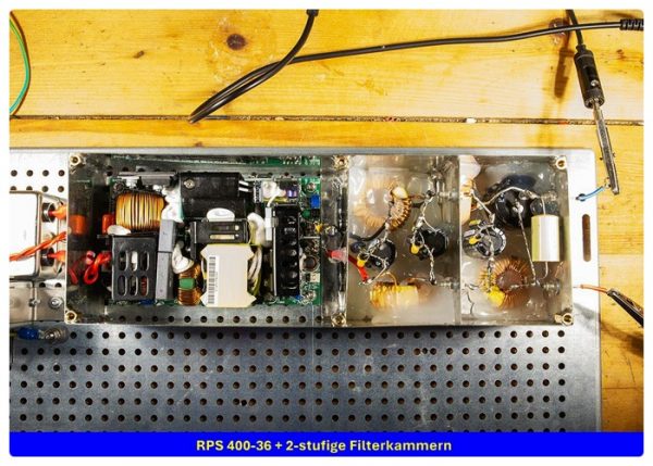 Man kann hier DIY-aktiv tätig werden. In einer ersten Stufe kann man industriell hergestellte, möglichst mehrstufige Filter zusätzlich verschalten. Sie bewirken sowohl auf der Primär- als auch auf der Sekundärseite eine Dämpfung des Störspektrums. Für den Fall von Arbeiten an der primären 220 V~ Seite sei nochmals an die anfänglich genannten fachlichen Vorrausetzungen für den entsprechenden Personenkreis erinnert!