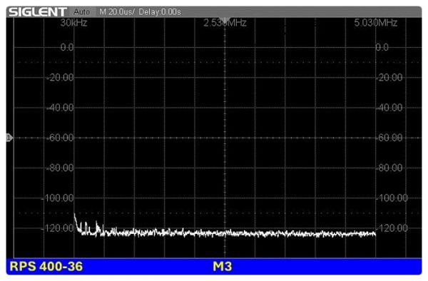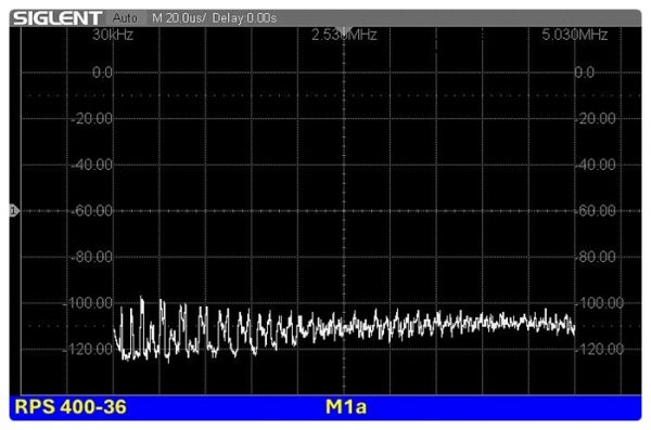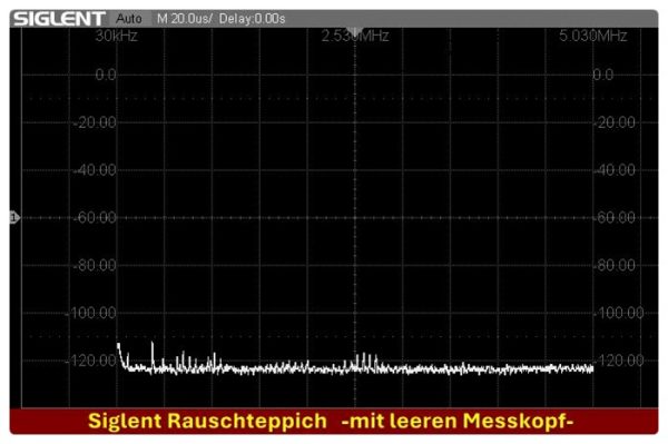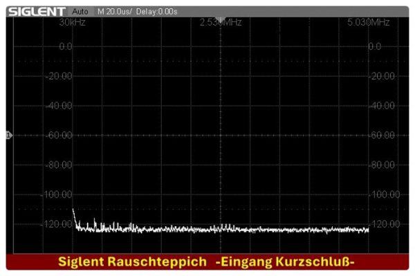 Diskussion: Geschafft! Was ich nicht erwartet habe, ist eingetroffen. Das breitbandige Störspektrum ist im Grundrauschen verschwunden, mit meinen doch recht empfindlichen Messmitteln ist nichts mehr festzustellen. Auch bei erhöhter Belastung mit 36 V / 9A blieb die Anzeige unverändert. Zum Vergleich nochmals das Bild des Eigenrauschens vom Siglent bei kurzgeschlossenem Messeingang.