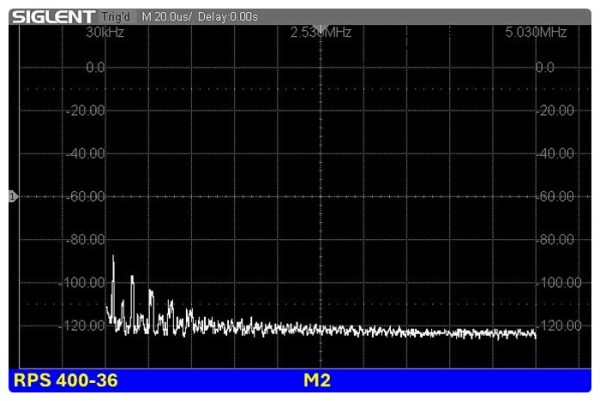 Mein medizinisches Meanwell RPS400-36 hat eine Eigenheit, der Taktoszillator für die Schaltfrequenz wobbelt. Die Schaltfrequenz hat einen Sweep von einigen Kilohertz, ein Frequenzdurchlauf benötigt ca. 10 Sekunden. Der Spektrumanalysator ist auf Mittelwertmessung eingestellt, nur so kann er das allgemeine Rauschsignal vom sehr kleinen Nutzsignal trennen. Das bedingt ein über den Wobbeldurchlauf zeitlich aufsummiertes Multifrequenzsignal welches diese etwas ‚verwaschene‘ Spektrum Anzeige ergibt.