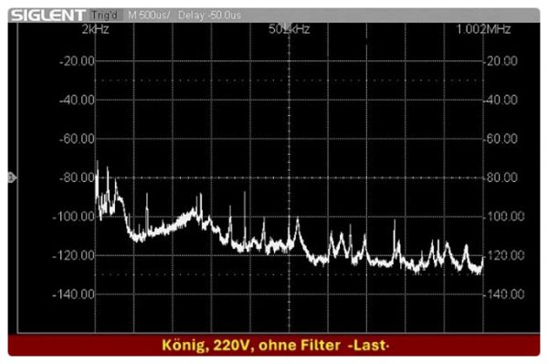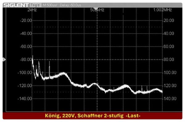 Es folgt das Universal Notebook Netzteil der Marke „König“, erst direkt an der 220 V Zuleitung gemessen, dann wieder mit dem Schaffner Filter.