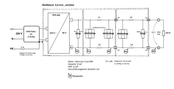 Weiter mit dem 2-stufigen Schaffner-Filter, dann zusätzlich die Kondensatoren: