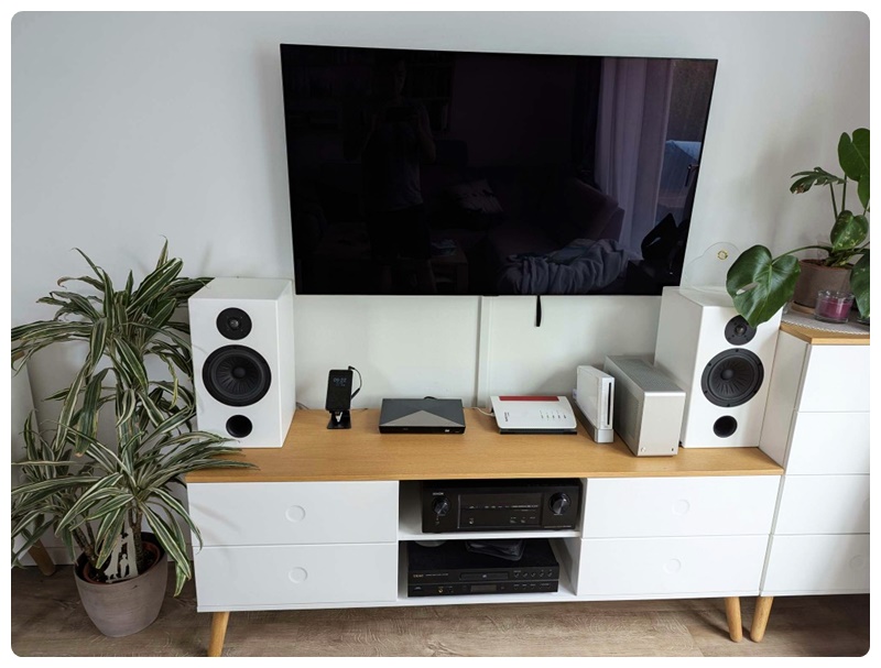 Falls die Familie mal ausfliegt, habe ich aber 2m Kabel hinter dem Sideboard liegen gelassen, sodass ich die Lautsprecher dann auf provisorische Ständer stellen kann für eine gemütliche Hörsession. Für den Alltag passt es aber so auch ganz gut.