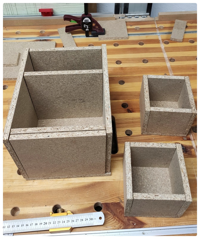 Im Prinzip ist der Bau dieses kleinen Sets ziemlich unspektakulär. Ich hatte noch einige Stücke unbeschichtete Spanplatte in 12 mm, dazu Reste von Eichen-Leimholz (15 mm) für die Fronten. Ich greife gerne für wenig Geld in der Reste-Kiste des örtlichen Baumarkts zu und für solch kleine Projekte sind die Reststücke meist mehr als ausreichend.