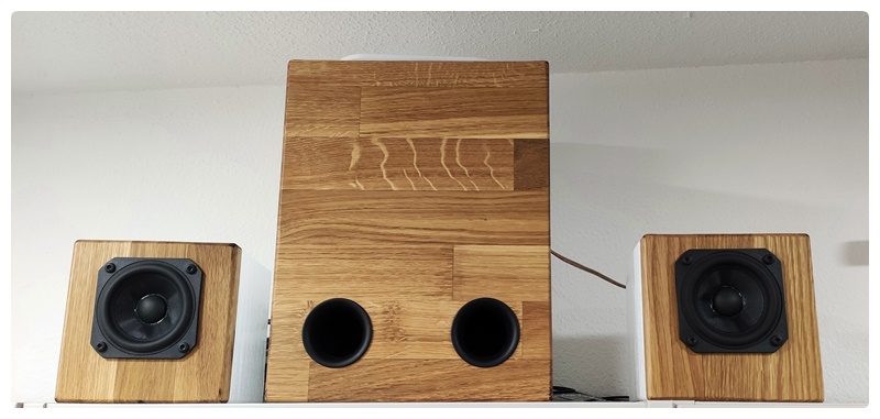 Der Rest des Zusammenbaus war Dienst nach Vorschrift und verlief reibungslos. Die beiden Reflexrohre musste ich mit ordentlich Druck überreden, sich bis zum Anschlag in den Sub zu versenken. Der Anschluss an den Arylic-Amp, der mittlerweile ein gedrucktes Gehäuse hatte, verlief ebenso problemlos, und nach wenigen Klicks sprudelten die ersten Töne meines Lieblings-Internetradiosenders aus den kleinen Kistchen.