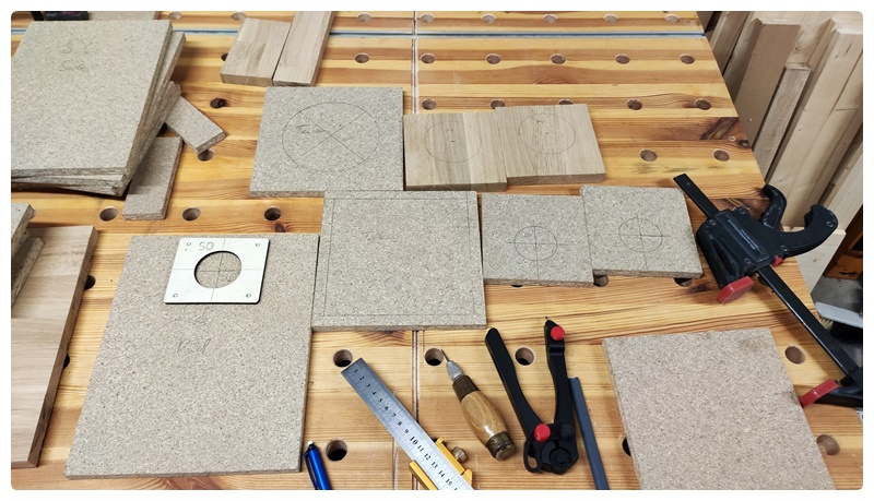 Im nächsten Schritt wurden die Ausschnitte angefertigt – zuerst alle Löcher für Chassis, Reflexrohre und Terminals angezeichnet, dann die Chassis-Öffnungen per Fräszirkel eingefräst.