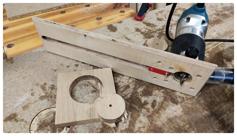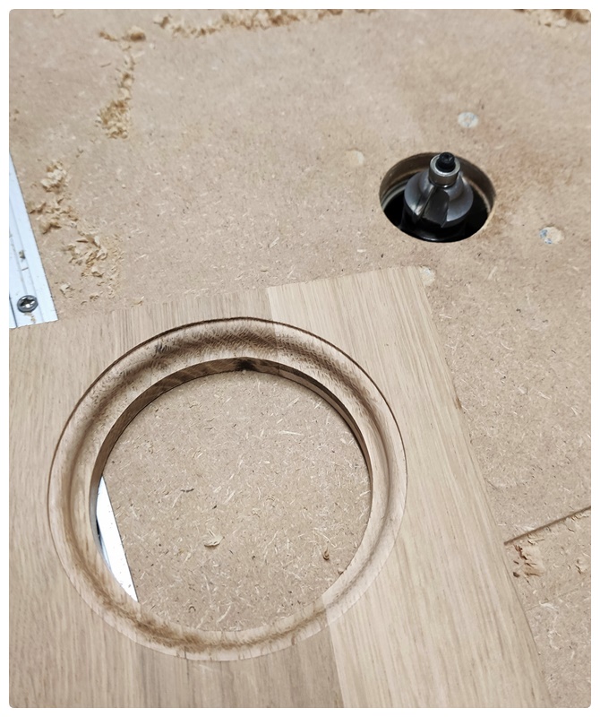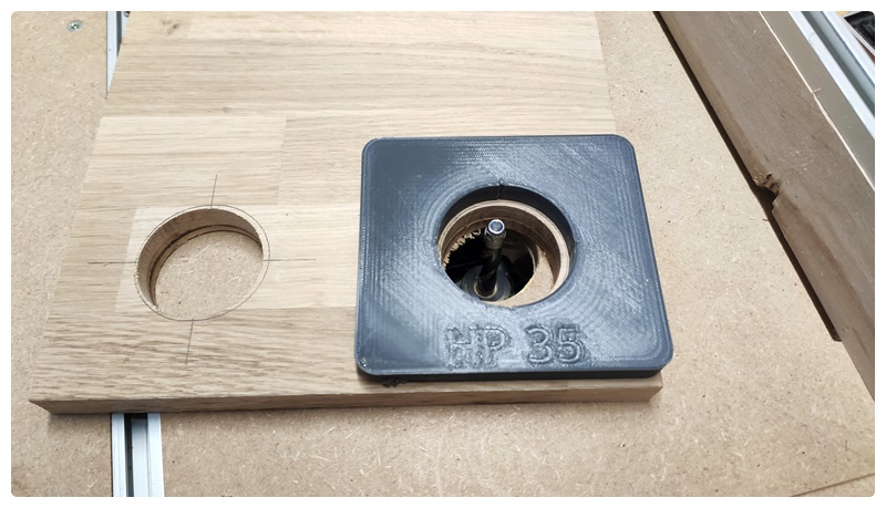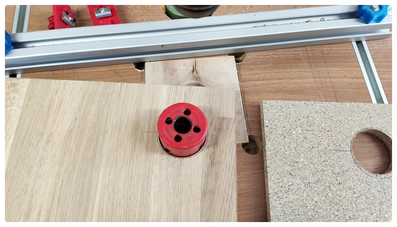 Weil ich mit dem Fräszirkel in Kombination mit meiner zierlichen Fräse immer etliche Durchgänge für einen sauberen Kreis brauche und damit das Risiko für Fehler steigt, habe ich mir für die anderen Löcher, deren Maße häufiger benötigt werden, eine weniger stressige Methode gesucht: Der Großteil des Materials wird zunächst mit einer 44 mm – Lochsäge entfernt.