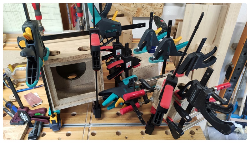 Im Anschluss ging es ans Verleimen, was ebenfalls eher unspektakulär ablief. Ich habe die Brettchen mit normalem Ponal-Holzleim verleimt. Zum Fixieren während des Zusammenbaus kam Sekundenkleber mit Härter-Spray zum Einsatz, das die Teile an einigen Punkten an Ort und Stelle hielt. Am Ende kamen dennoch richtige Zwingen zum Einsatz. Das Leimholz der Fronten war ein klein wenig verzogen, da brauchte es ordentlich Druck für einen spaltfreien Sitz. Am Ende kam aber alles einigermaßen so zusammen, wie erhofft.