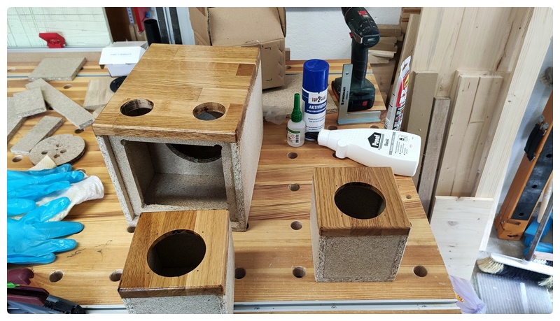 Für die Spanplatte habe ich mich zum ersten Mal an Folie gewagt. Dank des sehr schönen Videos „Folieren mit Stefan“ hier auf der Seite gelang das ziemlich gut, das Ergebnis ist sicher nicht perfekt, aber ich bin zufrieden. Mit Ruhe, Geduld, einem Heißluftfön und einem scharfen Messer ist die Folie erstaunlich gutmütig beim Aufbringen. Damit waren die Gehäuse fertiggestellt.