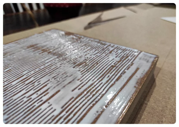 Der Leim wird beim Trocknen glasig und leicht trocken/ gelartig. Dauert ca. 10 Minuten je nach Wärme, Luftfeuchte (22 °C ca. 40%) und Leimsorte.