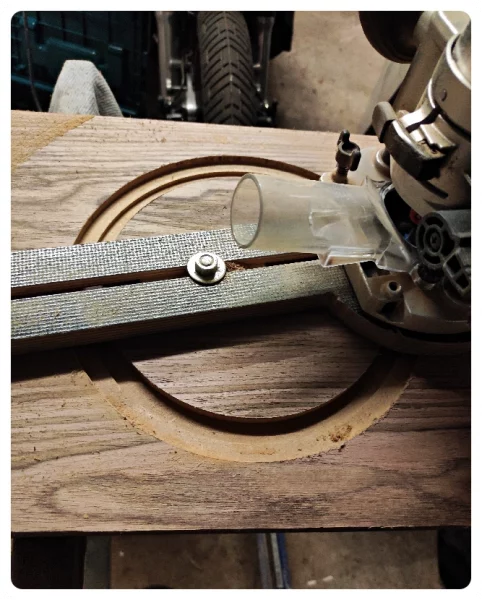 Ich habe festgestellt, dass die MDF-Platte nach dem Furnieren eine Wölbung aufweist, wobei die beklebte Seite eine leichte Konkavität angenommen hat, deshalb sollte man genügend Schraubzwingen zum Verleimen der Gehäuseteile einplanen. Es wäre durchaus möglich, dass ein Furnieren nach Zusammenbau die sinnvollere Methode gewesen wäre. Bevor das Gehäuse verleimt wurde, ging es ans Ausfräsen mittels selbstgebautem Zirkel.