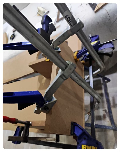 Nachdem die Schweinerei überstanden war, ging es ans Verleimen der Gehäuse. Das Ausrichten war etwas knifflig, aber die Abbundzeit des Leimes lässt die Möglichkeit der Korrektur zu. Hier auch auf einen gleichmäßigen Leimauftrag mittels Spachtel achten. Da sich die Zuschnitte wie bereits erwähnt ein wenig verzogen hatten, ist auf die richtige Reihenfolge zu achten, um die Durchbiegung gegeneinander auszumerzen.