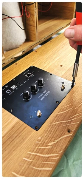 Gefühlte 50 Schrauben haben den Deckel fest verschlossen. Ein vorab an allen Innenkanten angelegtes Dichtband übernimmt den sicheren Verschluss. Alles passt, auch der rückwärtige Plate-Amp (Anmerkung der Redaktion: Der Plate Amp wurde mittlerweile durch den Up2Stream 2.1 ersetzt) floppt einfach ins vorgesehene Fach.