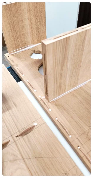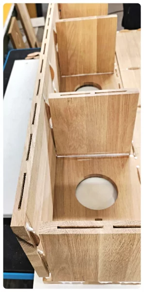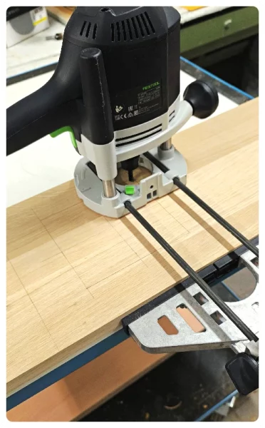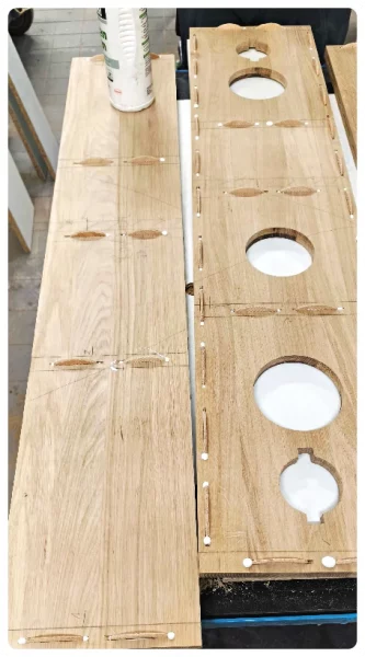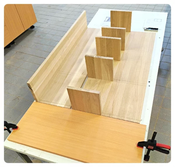 Der Zuschnitt der Bretter für die Soundbar kann als einfach beschrieben werden. Vier lange Bretter und fünf Teiler sind jetzt keine Zauberei. Das Verleimen dagegen schon. Wie in allen Projekten zuvor sollen Lamellos die Unterstützung der Verbindungsfugen übernehmen. Da die Kammeraufteilung innerhalb der Bar natürlich das Funktionieren des Systems bedingt, ist hier Obacht geboten. „Links“ und „rechts“ bekommen eine neue Bedeutung im Denken. Das Anzeichnen und Fräsen der Verbindungsschlitze hat gefühlt Stunden gebraucht, durchmarkieren inklusive.