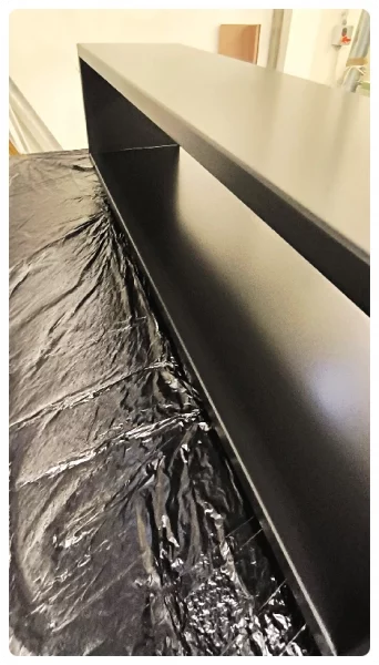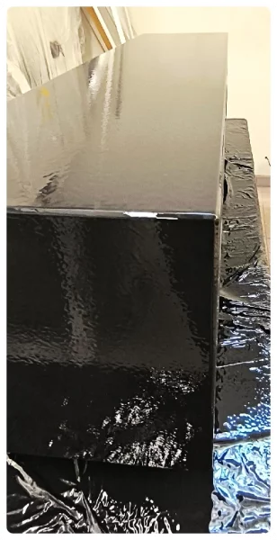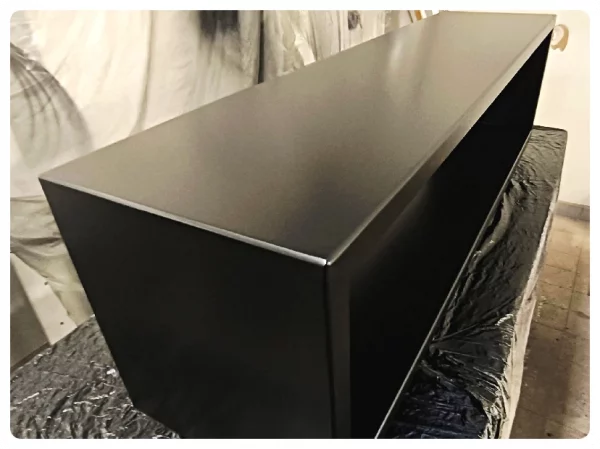 Letzte Unebenheiten sind somit abgedeckt und nach einem Tag Pause geht es wieder ans Schleifen, Körnung jetzt runter bis P400. Dass die Oberfläche an einigen Stellen bis zur Grundierung durchgeschliffen ist, geht vollkommen in Ordnung. Abblasen mit Druckluft und nebelfeucht abwischen versteht sich vor dem Lackieren von selbst. Wiederum im XVLP-Spritzverfahren kommt ein seidenmatter Lack in tiefschwarz zur Anwendung. Das sieht sehr edel aus und belässt das Ganze bei zwei „Farben“ Eiche und eben schwarz an Treibern, Bassreflex und Rahmen.