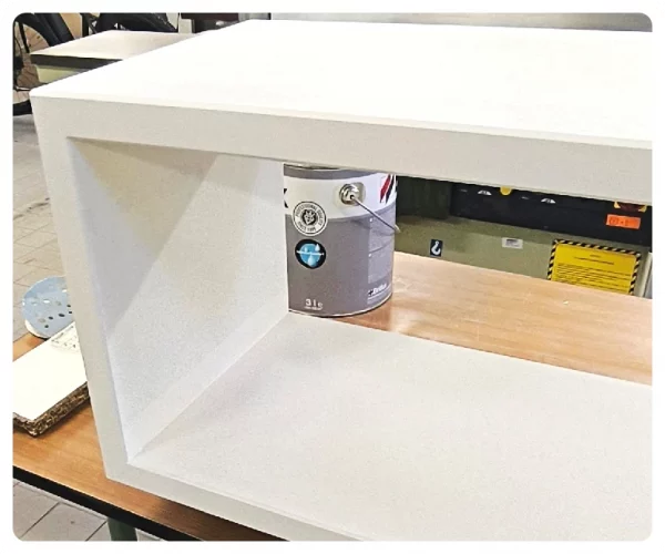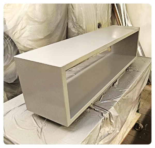 Hat er dann gelassen und schließlich mit neuen Ideen weiter gemacht. Da, wie oben beschrieben, das Plattenmaterial des Rahmens mit 19 mm schon im Test sichtbar durchhängt, wird es halt dicker. 28mm MDF ist stabil genug, um den fast vorhandenen Meter zu überbrücken. Aber groß und wuchtig haben wir ja schon gesehen und für nicht gut befunden… Also die Spikes im Rahmen abgewählt und auf durchsichtige, kleine Gummifüße gewechselt. Da ist der Abstand zum Rahmen dann ca. 5 mm und das Ganze wird gefälliger und deutlich schlanker. Auch hier habe ich vorerst einen Dummy aus Spanplatte hergestellt und die Bar mal reingestellt… Jupp, das hat was. Noch in Weiß und stumpf verleimt, aber man bekommt ein Gefühl das es doch was Schönes werden kann. Da die Spikes kein Geschenk waren und somit auch zur Anwendung kommen sollen, habe ich sie außen exakt unter den Gummifüßen platziert und dann auch mit dem hohen Gewicht der Bar keine Probleme. Und wo immer das Ungeheuer stehen wird ist es bestmöglich vom Untergrund entkoppelt. Ach so und der Schrank ist ganz gestrichen… 😊