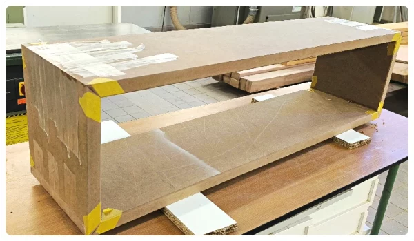 Jetzt kommt der harte Cut. Um in den ursprünglich geplanten Schrank vorab nicht zu viel Arbeit zu stecken, habe ich auf Empfehlung der Lehrmeister einen Dummy aus Spanplatte gebaut. Nur als formgebendes Ansichtsstück. Es ist echt beschissen (entschuldigt, aber treffender kann man es nicht artikulieren), wenn man so langsam mitbekommt, dass das Design nicht aufgeht. Die Größe des kompletten Möbels sprengt jeden Rahmen. Außerdem sieht der Rahmen mit einem Abstand von 30 mm zur Box einfach nicht aus. Der Abstand ist viel zu groß und die obere Platte hängt jetzt schon minimal durch.