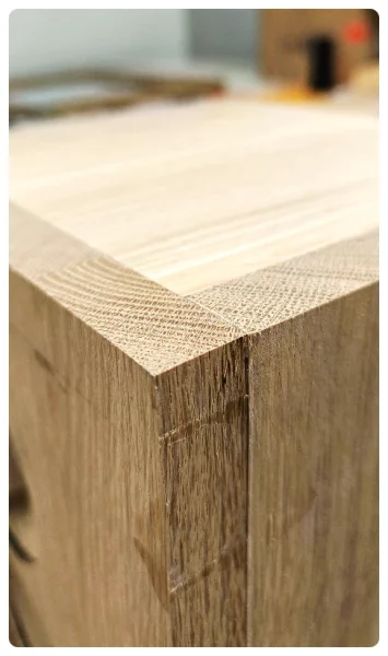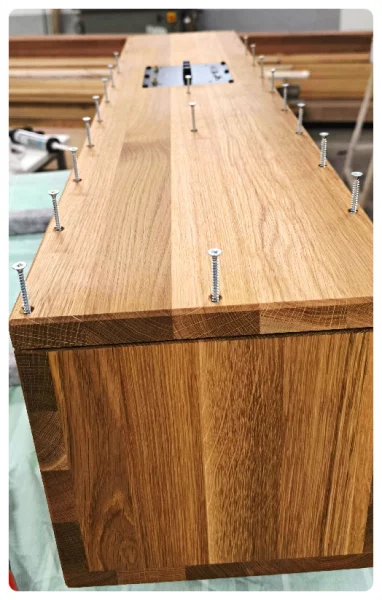 Ein Excenterschleifer mit abstufender Körnung P120, P150 und P240 ist zur Anwendung gekommen. Der Deckel ist mit Hilfe von Lamellos und bereits vorgebohrten Schrauben bereits erstmals geschlossen worden, um auch hier die Kanten mitzunehmen. Ich habe dann alle äußeren Kanten mit einem Handfräser und geradem Fräskopf abgefahren, um den Außenecken eine ansprechende Optik zu geben. Auch die bereits erwähnten Vertiefungen für die Aufnahme der Spikes sind gesenkt worden.