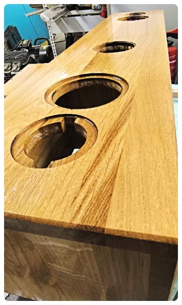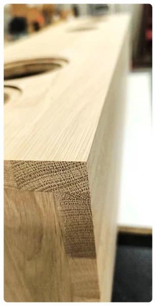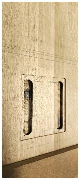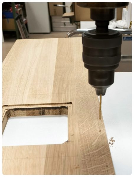 Nee, immer noch nicht. „Mach mal Teststücke aus MDF! Du bist im Echtholzbereich unterwegs“ Das ist als ultimative Weisheit schon vorher beim Lehrling angekommen, tatsächlich wären 2 von 3 Fräsungen in die Hose gegangen. Und 2 Probestücke sind am Rand ausgerissen. Am Ende sind alle Aufnahmen nahezu perfekt gelungen und die Frontplatte ein Augenschmaus.
