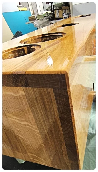 Anschließend gab es abschließende Schleifgänge in P320 und P500. Für das Oberflächenfinish kam wieder mein altes Zaubermittel aus reinem Walnussöl zur Anwendung. 2 satte Durchgänge mit Zuhilfenahme von dickem Industriepapier von der Rolle mit je einem Tag Pause lassen die Oberfläche seidig schimmern und es gibt keine Lösemitteldämpfe oder ähnliches.