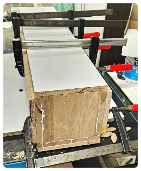 Dann mal los… 5 Millionen Lamellos wollen eingeleimt werden. Gesagt, getan. Und dann Stück für Stück mit reichlich Ponal zusammengefügt. Erst die Trennbretter auf den Boden, dann Front und Bodenplatte.