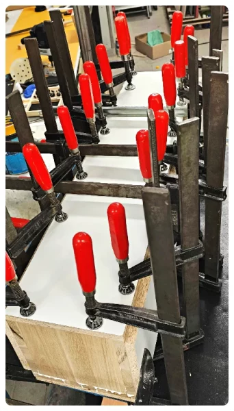 Wichtig ist, vor dem Ansetzen der Zwingen bei Echtholz unbedingt mit Zulagen zu arbeiten, die heftigen, punktuellen Anpresskräfte würden sehr unschöne Eindrücke hinterlassen. Und Schleifarbeit gibt es sowieso schon mehr als reichlich, die braucht man nicht noch zusätzlich hinzu.