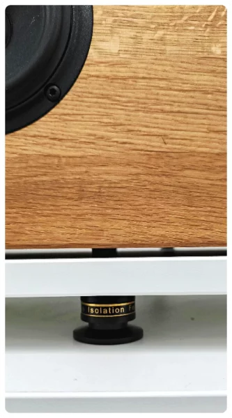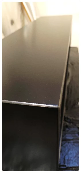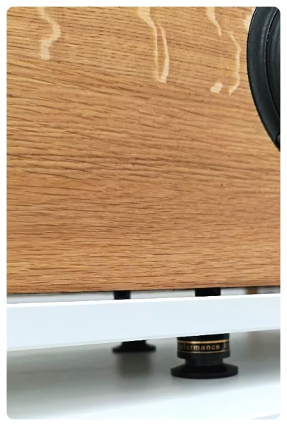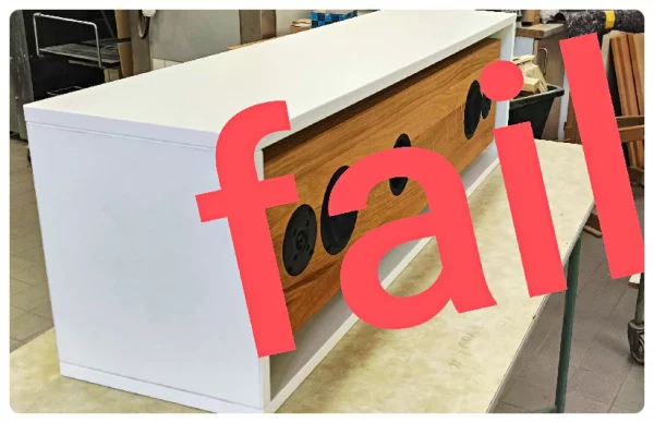 Hat er dann gelassen und schließlich mit neuen Ideen weiter gemacht. Da, wie oben beschrieben, das Plattenmaterial des Rahmens mit 19 mm schon im Test sichtbar durchhängt, wird es halt dicker. 28mm MDF ist stabil genug, um den fast vorhandenen Meter zu überbrücken. Aber groß und wuchtig haben wir ja schon gesehen und für nicht gut befunden… Also die Spikes im Rahmen abgewählt und auf durchsichtige, kleine Gummifüße gewechselt. Da ist der Abstand zum Rahmen dann ca. 5 mm und das Ganze wird gefälliger und deutlich schlanker. Auch hier habe ich vorerst einen Dummy aus Spanplatte hergestellt und die Bar mal reingestellt… Jupp, das hat was. Noch in Weiß und stumpf verleimt, aber man bekommt ein Gefühl das es doch was Schönes werden kann. Da die Spikes kein Geschenk waren und somit auch zur Anwendung kommen sollen, habe ich sie außen exakt unter den Gummifüßen platziert und dann auch mit dem hohen Gewicht der Bar keine Probleme. Und wo immer das Ungeheuer stehen wird ist es bestmöglich vom Untergrund entkoppelt. Ach so und der Schrank ist ganz gestrichen… 😊