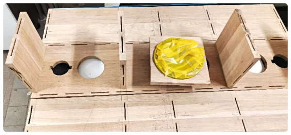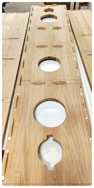 Der Zuschnitt der Bretter für die Soundbar kann als einfach beschrieben werden. Vier lange Bretter und fünf Teiler sind jetzt keine Zauberei. Das Verleimen dagegen schon. Wie in allen Projekten zuvor sollen Lamellos die Unterstützung der Verbindungsfugen übernehmen. Da die Kammeraufteilung innerhalb der Bar natürlich das Funktionieren des Systems bedingt, ist hier Obacht geboten. „Links“ und „rechts“ bekommen eine neue Bedeutung im Denken. Das Anzeichnen und Fräsen der Verbindungsschlitze hat gefühlt Stunden gebraucht, durchmarkieren inklusive.