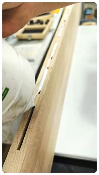 Dann Endspurt und den Rahmen angegangen. Vier Bretter sind wieder keine Zauberei, eine innenliegende Phase und Verleimung auf Gehrung hingegen wieder schon. Also erst phasen und dann verleimen. Das ist wichtig, wer „um die Ecke fräsen an Innenkanten“ mal probiert hat und sich über folglich händisch ausgestochene Innenecken schwarz geärgert hat weiß was ich meine. Die Klebebandtechnik an den Gehrungen und viel Leim lassen vier Bretter zu einem verschmelzen.