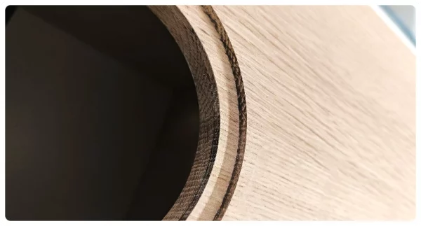 Selbst das Bassreflexrohr hat eine hauchdünne Vertiefung bekommen und ist oberflächenbündig eingelassen. Selbiges gilt für Aufnahme des Plate-Amps auf der Rückseite. Nice, wirklich nice für einen Lehrling.