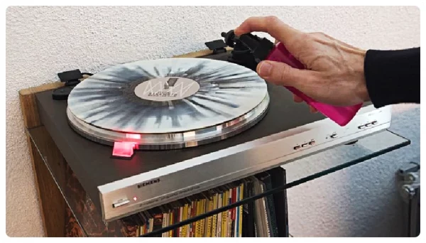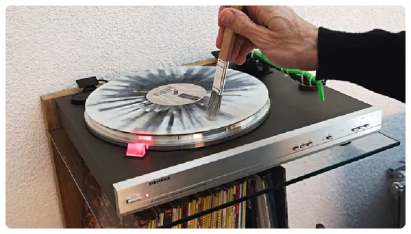 Zum Reinigen einen Pinsel aus dem Baumarkt besorgt. Nach dem Einsprühen der rotierenden Scheibe halte ich den 2cm breiten Pinsel drauf. Danach den Staubsauger in den Wasserabscheider einstecken und manuell absaugen. So behandelte neue Platten sind nach der Prozedur frei von jeglichen Knacksgeräuschen. Bei älteren Scheiben lasse ich die Flüssigkeit auch mal 5 -10 Minuten einwirken. In der Zeit wird die nächste Scheibe herausgesucht. Die Flüssigkeit ist Alkohol mit destilliertem Wasser. Ich bevorzuge 1/3 Alkohol, 2/3 Wasser und einen Tropfen Spülmittel. Mit dem geringeren Alkohol-Anteil verdunstet die Flüssigkeit bei den einzuweichenden Scheiben nicht so schnell.