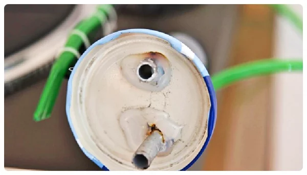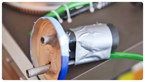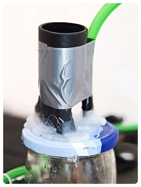 Der alte, wie ich finde hochwertige Siemens, eigentlich ein japanischer Dreher, hatte den Geist aufgegeben. Immerhin drehte er noch. Zudem sehr schnell. Der Schlauch war ruck, zuck gekauft. Alu-Röhrchen an den Schlauch angestöpselt, und mit jeder Menge Heißkleiber mit dem Deckel des Gurkenglas-Wasserabscheiders verbunden. Der Adapter für den alten Staubsauger war noch übrig und wurde fix modifiziert. Auch der landete auf dem Deckel des Wasserabscheiders.