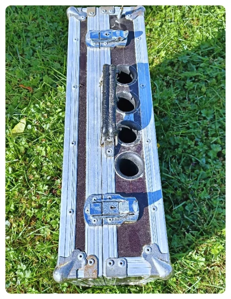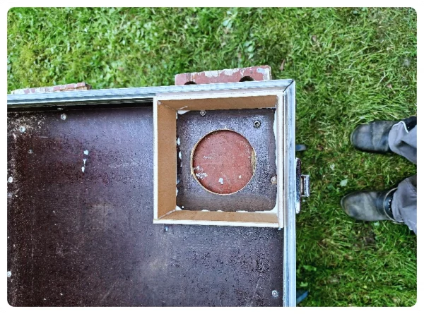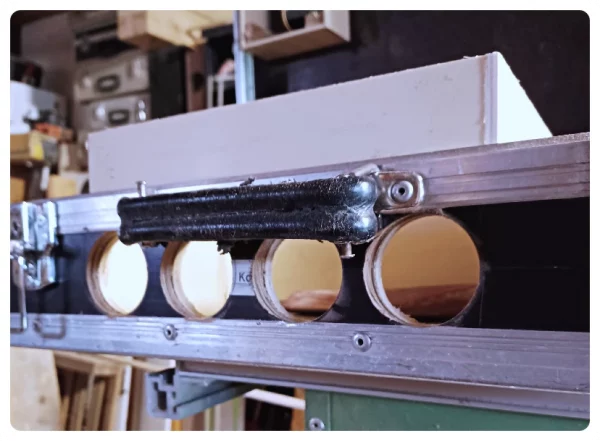 Die BR-Rohre sind zu lang um senkrecht in Deckel oder Boden eingebaut zu werden und deren Außendurchmesser ist 1 mm größer als die Holzfläche zwischen den Aluprofilen. Bei der Tiefe des Amps hatte ich anfänglich den Platzbedarf für die Stecker nicht mit einkalkuliert. Gleiches beim Netzteil. Für die Innereien des Koffers hatte ich Sperrholzreste vorgesehen. Die wollten sich anfänglich nicht mit der Siebdruck-Oberfläche des Koffers verkleben lassen. Ich wollte ein Problem nach dem andren lösen.