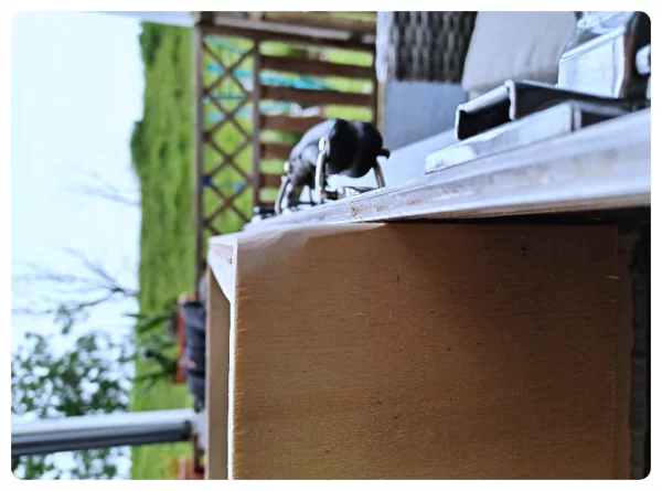 Leider habe ich erst zu diese Zeitpunkt den Deckel erstmals schließen wollen. Es klemmte überall. Hatte ich doch übersehen, dass der Rand des Deckels ja über den Rand des hochstehenden Bassgehäuses schwenken muss. Also Kanten geschiffen, probiert, mehr geschliffen, probiert, mehr geschliffen, probiert. Dann waren alle Kanten ausreichend „gerundet“,