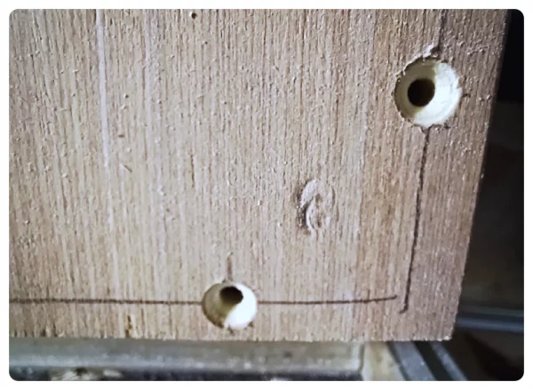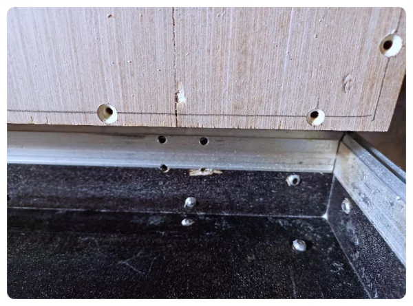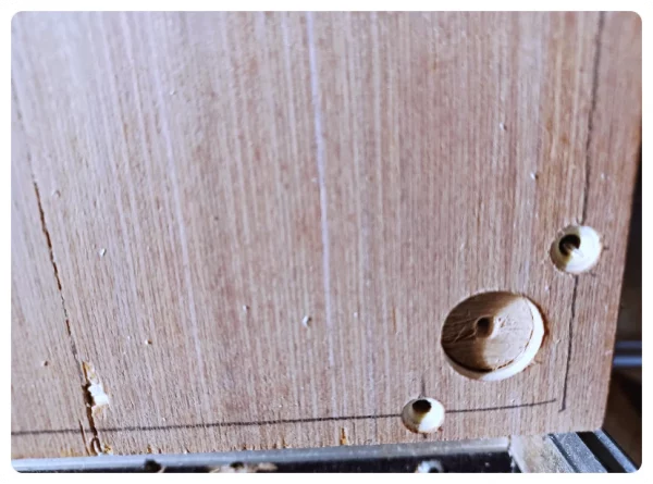 Deren Herkunft war dann schnell gefunden. Es waren die Nieten im Deckel. Die standen logischerweise etwas hervor. Also an den Druckstellen mit einem Forstnerbohrer etwas Material weggenommen und schon flutschte es. Passt!