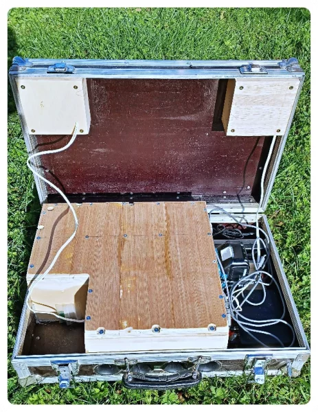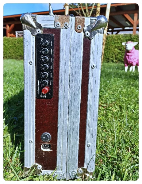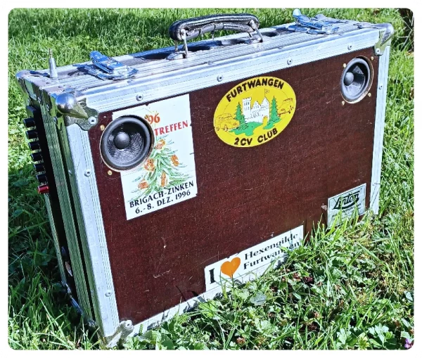 Wie lange hält eine Akkuladung? Keine Ahnung. Ein 3AH-Akku hält mindestens 4 Stunden Vollgas. Der Amp wird dabei gut handwarm. Im Netzbetrieb erreicht das Netzteil auch gut Handtemperatur. Ich finde es unkritisch. Notfalls könnte man den Deckel ein Stückchen auflassen. (Da gab es in den 70er Jahren für die kleinen Heckmotorautos so „sportliche“ Aufsteller für die Heckklappe) Die ganze Aktion hat sich gelohnt, das Kofferradio wiegt mit Akku 16 Kilo, was dank Tragegriff gerade noch gut zu händeln ist. Und stabil ist das Ganze auch noch. Nicht unbedingt schön, weil alt und abgeschlagen. Aber genau das macht es für mich aus.