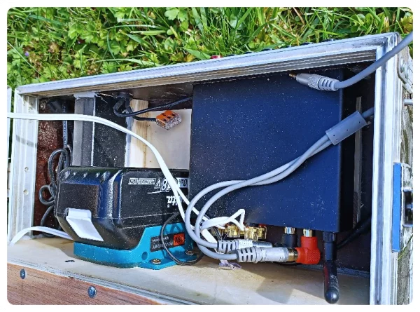 Die Halterung für den Makita-Akku und die restliche Verkabelung waren schnell abgehakt. Verdammt eng alles. Winkelstecker halfen. Es war sogar noch Platz für die BT-Antenne. Passt.