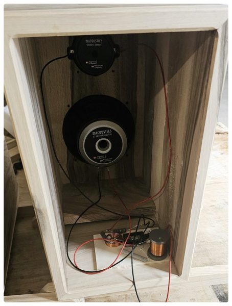 Chassis sind eingebaut und die Frequenzweiche war dank der guten Beschreibung auch schnell gelötet und fertig zum Einbau. Das Ganze habe ich mit den mitgelieferten Torx-Schrauben eingebaut und die Weiche mit Heißkleber fixiert. Rückwand drauf und ausprobieren.