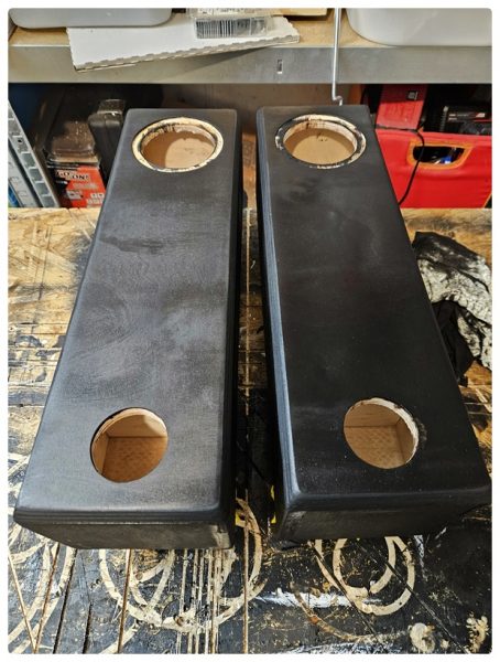 Die Fronten wollte ich diesmal auf 25 Grad fräsen und dann die Ecken rund schleifen. Nach Ralfs Video habe ich mich bei der Mini ACL das erste Mal am Beizen probiert und mich für Schwarz entschieden. Das hat wunderbar funktioniert und mir gefällt es sehr gut, dass die Maserung noch leicht durchschimmert. Das Finish habe ich dann mit normalem Leinöl Firnis gemacht und ich war mit dem Ergebnis zufrieden. Lediglich beim nächsten Mal muss ich definitiv besser schleifen. An manchen Stellen sieht man noch Leimreste. Beim Streichen der SB15 war das egal, aber hier fällt das auf.