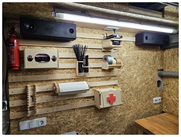 Mittlerweile konnte ich dann endlich die Vorwand und die ersten French Cleats in der Werkstatt anbringen und die Mini ACL ist auf Ihren finalen Platz gewandert. Genau so hatte ich mir das vorgestellt. Der Verstärker musste auf ein Provisorium, da ich keine Lust hatte noch länger zu warten. Das wird irgendwann noch in Schön gebaut, aber man braucht ja gut klingende Musik dazu. Einen großen Nachteil hat die Mini ACL jedoch: Sie hält mich regelmäßig vom Arbeiten in der Werkstatt ab da ich dann der Musik lausche.