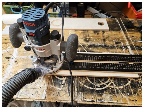 Daher bin ich am nächsten Tag nochmal zum Baumarkt gefahren, habe die Platten reklamiert und umgehend neue gerade Stücke erhalten. Dann konnte es am Abend schon losgehen. Die Ausschnitte waren mit der Oberfräse und dem Fräszirkel sehr schnell gemacht und das Verleimen auch keine große Sache. Mittlerweile hatte ich auch ein wenig Übung.