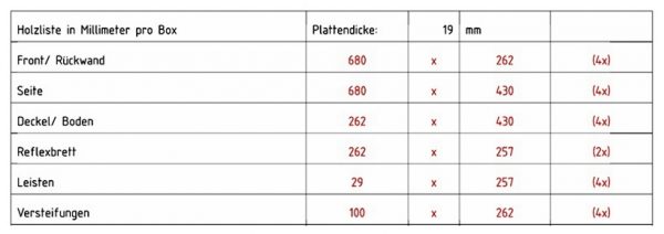 Genug war es nicht, um alle Bretter für 2 x drei optisch ansprechende Kisten zu schneiden. Aber hier geht es nicht um Schönheit, sondern ausschließlich um Funktionalität. Das Bassabteil der zweiteiligen Lady ist 68 cm hoch, 30 cm breit und 43 cm tief. Zwei der Kisten stehen hier mit aufgesetzter Multiplex-Front in schön aufgebaut als Unterteile der Lady, für zwei weitere brauche ich bei seitlich eingesetzter Front: