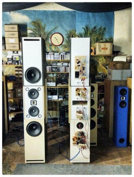 Keine Sorge, jetzt folgen nicht die vielen Bilder namens “Udo leimt Bretter zusammen”, der Tower entstand nicht als Nachbau-Anregung aus der “So geht es”-Rubrik. Diesmal reicht es aus, das Ergebnis in seiner ganzen Hässlichkeit auf den Leser wirken zu lassen. Die drei Kisten pro Seite wurden einfach übereinander gestapelt, Halt geben zwei seitlich angeschraubte Bretter. Dass auf dem Bild tatsächlich 16 BelAir-Bauvorschläge zu sehen sind, wird niemand auf den ersten Blick ahnen. Doch bei genauem Hinsehen erkennt man unter der Röhre meine beiden Monoblöcke aus Hypex FA 122 und auf den Big 5 die FA 123, mit denen alle Boxen aktiv oder passiv laufen.