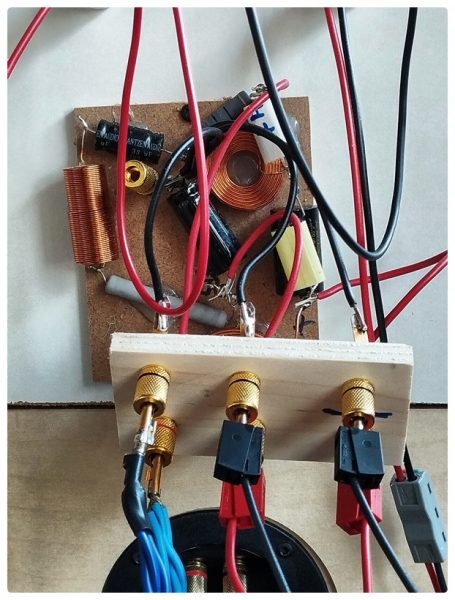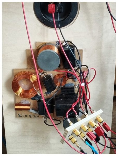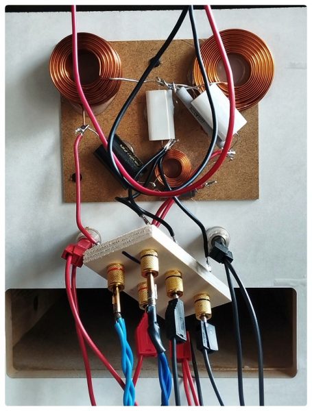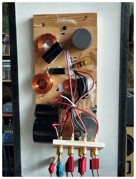 Für das fehlerfreie Umstecken habe ich ein Brettchem mit Polklemmen mit den Weichen verbunden. Wo das Signal anliegt, habe ich durch einen Strich markiert. Auf der anderen Seite wird immer der Hochtöner abgeschlossen, dazwischen Bass und – wenn vorhanden – Mitteltöner. Um die BelAir 72 vorzuspielen, werden die beiden MW 16 P-8 parallel geschaltet. Bei der GrandLady kommen auch noch die Bässe dazu. Beim aktiven Aufbau dürfen die Weichen nicht mitmachen. Also werden sie einfach abgestöpselt und die Chassis in der jeweiligen Konstellation direkt mit dem FA 122 oder FA 123 verbunden.