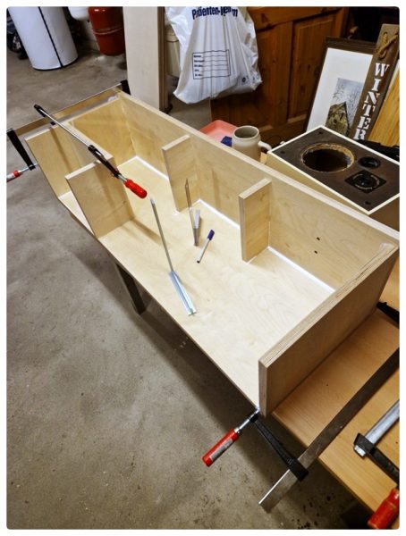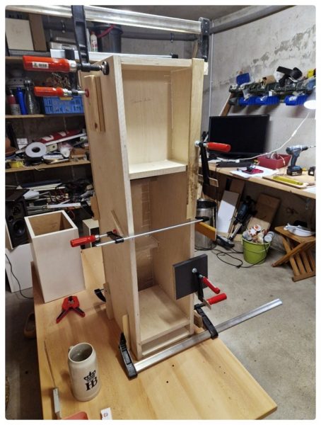 Alle Arbeiten konnte ich im Keller durchführen; nur das Fräsen der Rundungen für die Chassis machte ich im Freien. Die einzelnen Bretter für die Boxen legte ich dann nach Plan zusammen, beschriftete sie und fing an, die Teile zusammenzuleimen. Ich baute nicht beide Lautsprecher parallel, sondern fing mit der ersten Box an.
