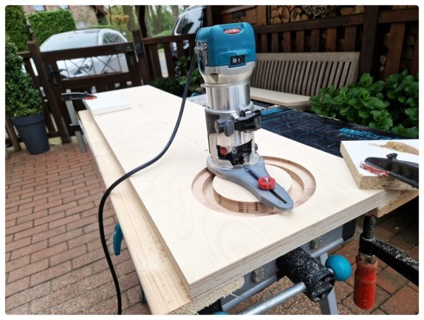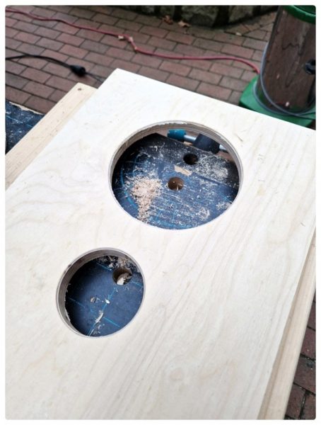 Die Schallwände fräste ich dann im Garten, um nicht den ganzen Staub im Keller zu verteilen. Ich hatte mir fürs erste Projekt schon mal einen Fräszirkel zugelegt, der ganz gut funktionierte. Ein bisschen Bammel hatte ich schon, als ich anfing, den ersten Kreis zu schneiden. Die Fräse geht wirklich gnadenlos zu Werk. Wenn sich die Arretierung des Zirkels lockert, wars das mit der Schallwand, dachte ich. Aber zum Glück lief alles so wie gewünscht. Das hat dann richtig Spaß gemacht und als auch die Chassis dann noch reinpassten – ich war richtig stolz auf mich, dass das so wunderbar klappte. Das war und sah richtig perfekt aus!