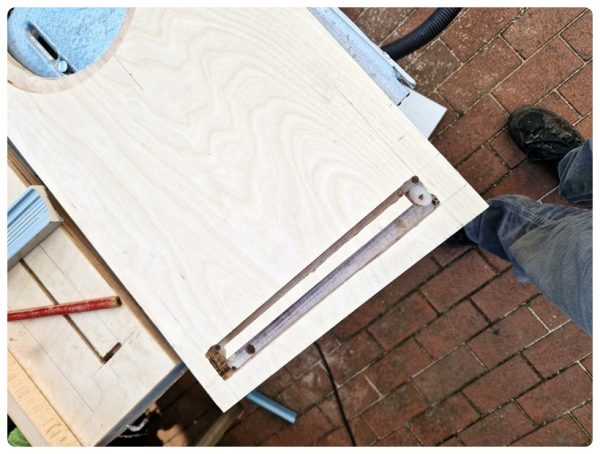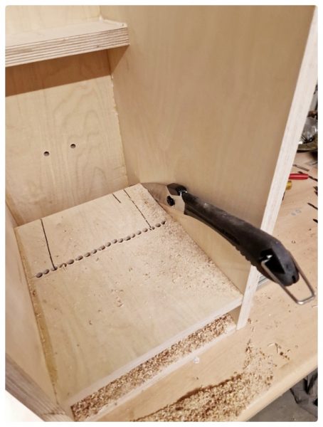 Okay, also kürzte ich das Brett umständlich mit Bohrer und Feile – einen Schönheitspreis konnte ich damit nicht erzielen, aber zum Glück sieht man die Kante ja nicht.
