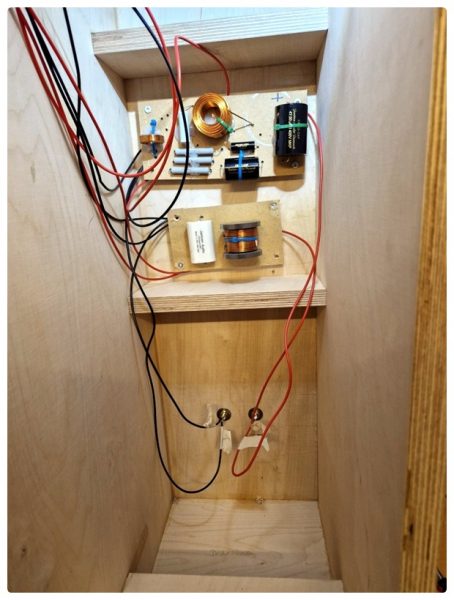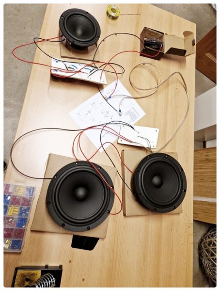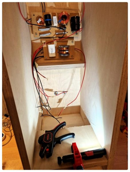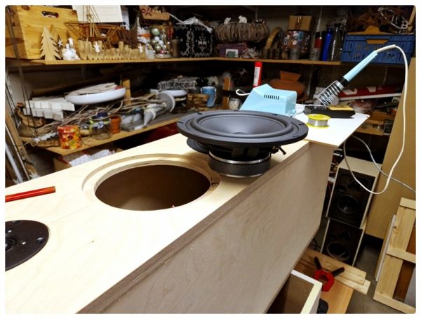 Bevor ich die Schallwände verleimte, machte ich zuerst einen kurzen Test, ob alles richtig verdrahtet war. Erfreulicherweise kam auch ein Ton aus den Chassis heraus – es hörte sich zwar noch ein bisschen kläglich an, aber das war ja auch nur ein Test.