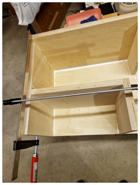 Als ich dann die erste Box bis auf die Schallwand fertig hatte, legte ich schon mal die Bretter für die zweite Box zurecht. Doch was war das?! Ich hielt 2 Bretter in der Hand, die eigentlich über den Bassreflexschlitz positioniert werden. Das konnte doch nicht sein. Ich sollte doch nur noch ein Brett übrig haben. Was hatte ich denn da bloß eingeleimt?