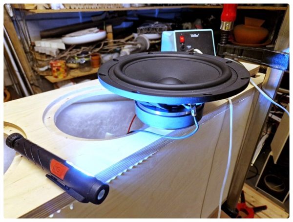 Bevor ich die Schallwände verleimte, machte ich zuerst einen kurzen Test, ob alles richtig verdrahtet war. Erfreulicherweise kam auch ein Ton aus den Chassis heraus – es hörte sich zwar noch ein bisschen kläglich an, aber das war ja auch nur ein Test.